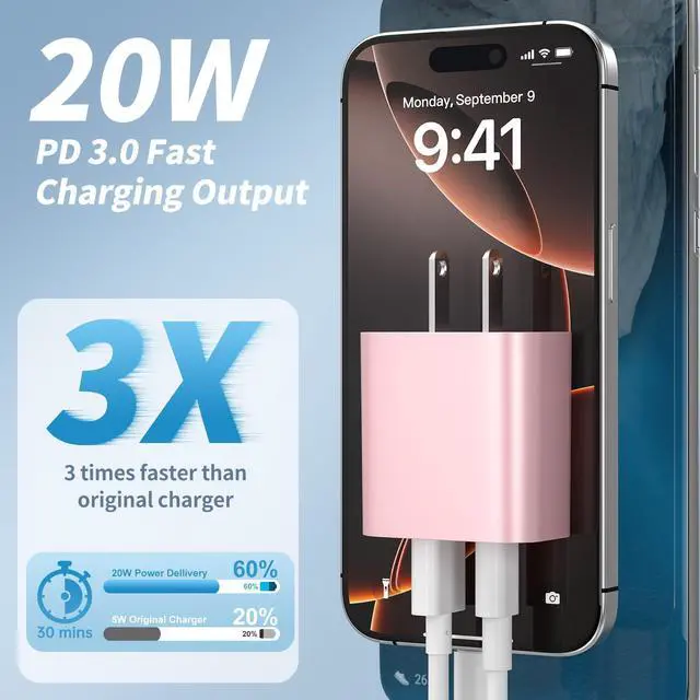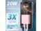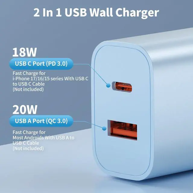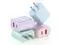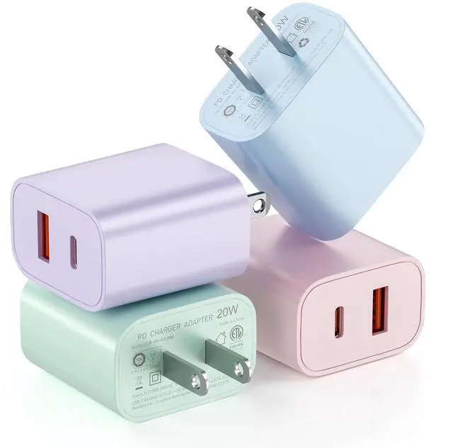 This adapter comes in a 4-pack featuring one each in pink, green, blue, and purple. It features a dual-port design combining USB C and USB A connectors. Supporting fast charging, the USB C port delivers up to 20W output power while the USB A port provides up to 18W output power. The USB C port can charge an i-Phone to over 50% in just half an hour. With broad compatibility and a compact, portable design, it saves space when traveling.