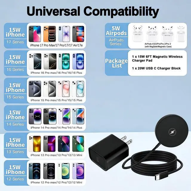 ![Main image of [Apple MFi Certified] iPhone Magnetic Wireless Charger 15W 6FT Mag-Safe Charging Pad with USB C Fast Wall Charger Block for iPhone 17 Pro Max/Air/16E/16 Plus/15/14/13/12/11/AirPods Pro 3/2(Black)](https://c1.neweggimages.com/productimage/nb640/C67GD2604220YLZ2YD0.jpg)