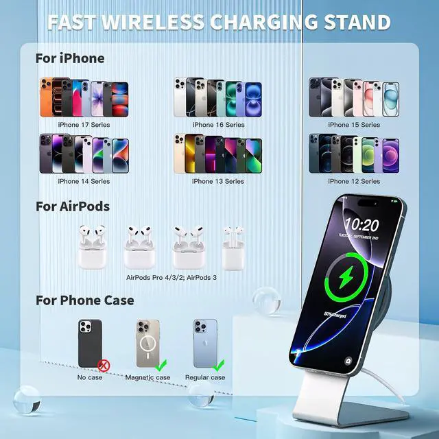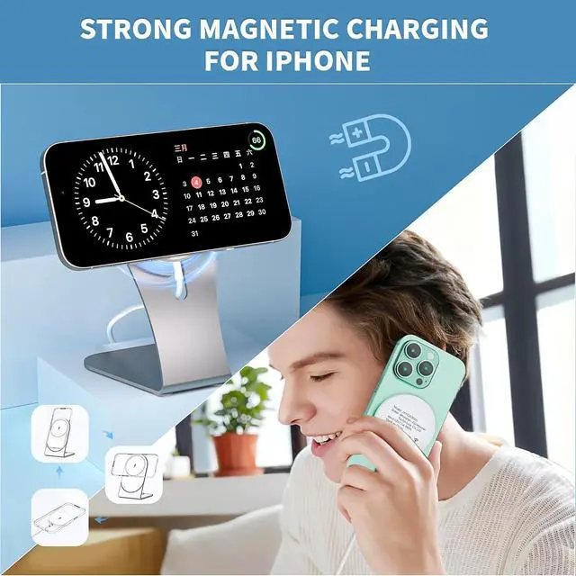 2-in-1 Magnetic Charging providing a seamless and efficient charging experience strong magnetic can switch the angle 360°of the charger pad, allows the magnets to attach to your iPhone perfectly. Offers you the flexibility to charge your device comfortably to meet your needs while charging.