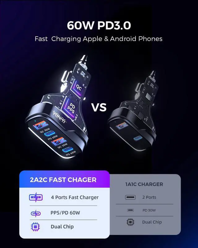 Fast-charging 4 devices at the same time. Intelligently distributes to provide optimal charging. PD60W / PPS60W Max supports your phone charging 0%~100% in just 35 minutes; Max supports your laptop charging 0~85% in 60 minutes.