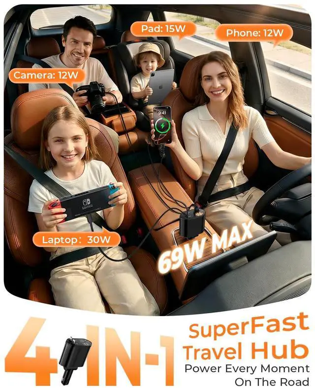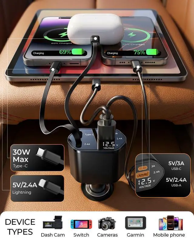 All-in-One Car Charger: Equipped with 2 retractable cables (Type-C & Lightning) and 2 open ports (USB Type-A & USB Type-C), this 69W 4-in-1 car charger supports simultaneous fast charging for iPhones, Samsungs, tablets, dash cams, switch and more. Notably, when charging 4 devices at once, the Type-C cable provides 30W fast charging, while the Lightning cable and the 2 open ports share a total of 15W.