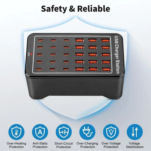 The 15USB-A +15 USB~C port is the standout feature of this USB~C charging station, providing lightning-fast charging speeds for up to 25 devices at once!