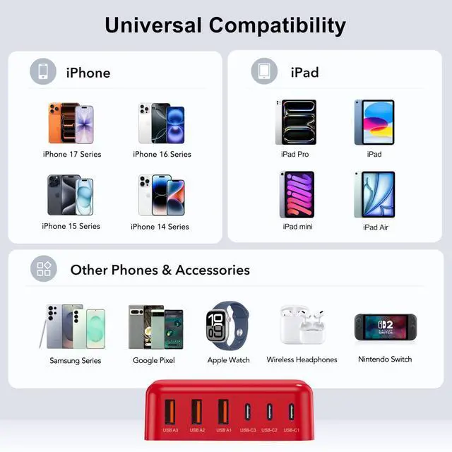 ![Main image of [2026 Updated] USB C Fast Charger, 100W GaN 6 Port Type C Charging Station Hub Block Cube, USB C Wall Charger Power Strip Adapter Plug for iPad iPhone 17 16 15 14 Pro Max Pixel Note Galaxy, 5ft Cord](https://c1.neweggimages.com/productimage/nb640/C5U4D2604270OK3HQE5.jpg)