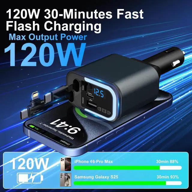 Super Fast Charging & Universal Compatibility: This car charger works flawlessly with iPhone 17/16/15/14/13/12 (ideal for iPhone 16/15 fast charging), Samsung, and all USB-C/USB-A devices. Deliver up to 120W max super fast charging for compatible modelsget a quick power boost during your drive without waiting around. The built-in digital display shows real-time charging status at a glance, so youll always know your devices power level