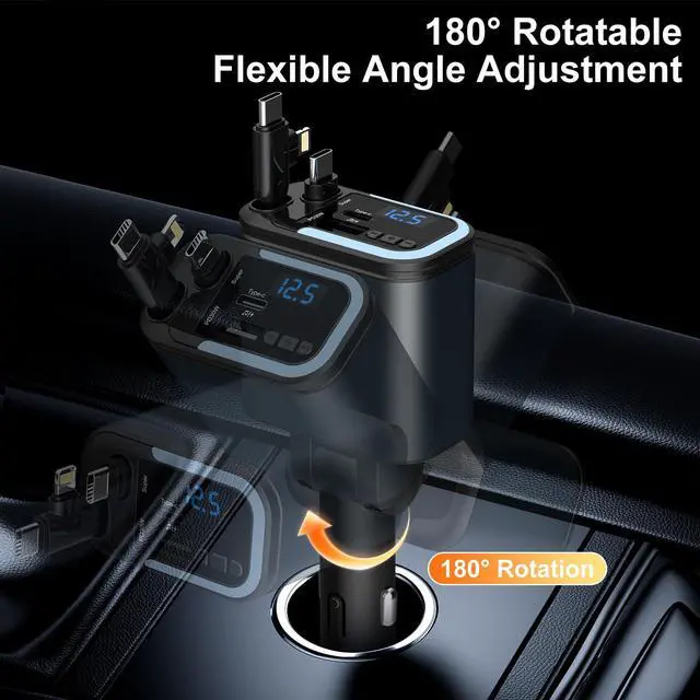 Bluetooth & Hands-Free Entertainment: More than a chargerthis retractable car phone charger supports Bluetooth pairing, FM transmission, and USB flash drive MP3 playback. Built-in buttons let you switch songs, answer calls, and adjust volume easily. Plus, it adds a soft light blue ambient light (gentle, non-glare) to elevate your cars vibe, turning your vehicle into a cozy mobile entertainment center perfect for long road trips or night commutes