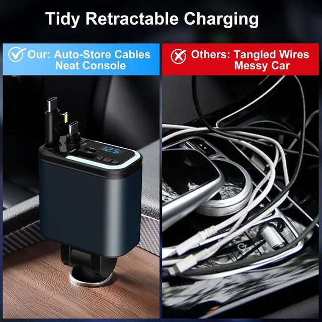 5-in-1 A+C Dual Fast Charging Retractable Design: This retractable car charger packs 2 extendable 80cm cables (Type-C & Lightning, 30W each), a 120W Type-C port, and a 5V/3.1A USB-A portcharge up to 5 devices at once (phones, tablets, GPS). It features A+C dual fast charging to power your Apple/Android devices quickly, while the retractable design banishes tangled wires, keeping your car neat and organized. A must-have car charger retractable for all on-the-go power needs