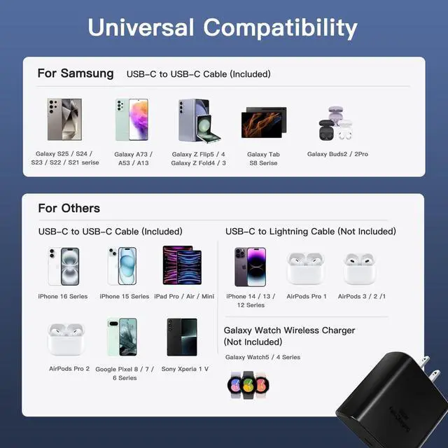 - [One Fits All]With support for PD3.0, PPS, QC3.0 ,AFC and other protocols, this fast usbc charger works seamlessly with a variety of devices,perfect to super fast charge Samsung Galaxy S25 Ultra/S25+/S24 Ultra/S24+/S23 Ultra/S23+/S22 Ultra/S22 Plus/S20 Ultra/Note 10+, Galaxy Tab S8/Ultra,Galaxy S25/S24/S23/S22/S21+/S21 Ultra/FE/S20+/Z Fold 3/Z Fold 4/Z Flip 4 and other android usb-c devices.It also compatible with iPhone 16/15 Series,iPads, Apple Watch, AirPods and more.