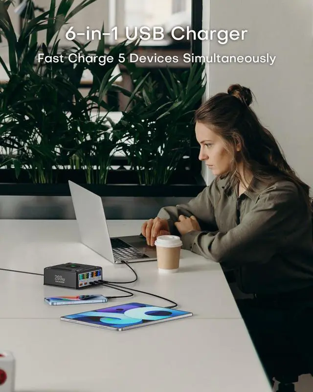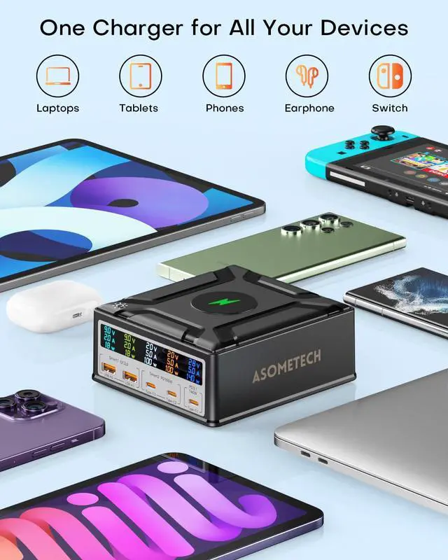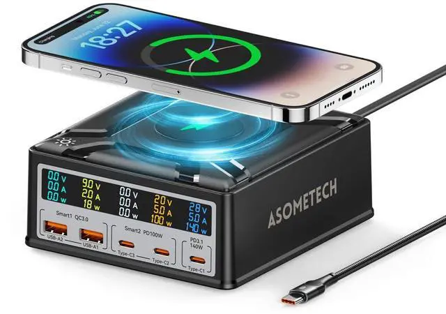 The multi usb charger supports wireless charging, 5 ports usb fast charging, realizing simultaneous charging of multiple devices at the same time.USB charging station equipped with a lcd display, can clearly see the voltage and current and power of each port. The multiport usb charging station built-in GaN III technology.Provide fast charging speed.The charging station has an automatic allocation function. Each time a port is inserted, the charging speed will be automatically adjusted according to the device. Support PD 140W Fast charging.In addition. The screen also has a touch button, which can be turned on or off at any time, even at night without disturbing sleep. It is a good partner for family and office.