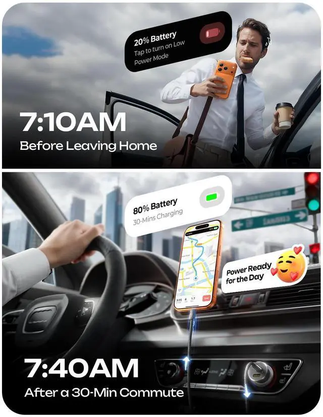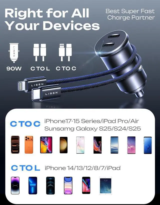 DC Plug: Auto-Auxiliary-Power. * DC Voltage Input: 12-24V. * USB Ports and Naming: Marked (Top to Bottom): both are identical with PD in-between (referred to hereon as: C1, C2). * Color: Black. USB Specifications: ? USB Charger Transistor Semiconductor: GaN (Gallium Nitride; superior to traditional Silicon chargers; enabling: higher power handling and faster charging, higher energy-efficiency and lower heat generation, smaller size and lighter weight)?: Not Specified. + USB Ports: + USB-C x 2. + USB Devices Charged / Powered Simultaneously: 2. + USB Charging Technologies and Protocols: + USB-IF PD (Power Delivery)?: Yes. + PD: PPS (Programmable Power Supply) Protocol?: Yes. + USB Charging Technology: Revision: + PD: 3.0 . + USB Power Output (Total): 90W. - USB Power Output, in Single-Port Output Mode, using the Single Highest Power USB Port (Max): Equal to (no less than) the Chargers USB Power Output (Total)?: NO!: 45W (Max) vs. 90W (Total). Safety: Protections: + Over-Current + Over-Voltage. + Over-Temperature. + Short-Circuit. + Non-Flammable (Fire Resistant Materials). Design, Build, Durability, Use Comfort, Esthetic: + Material: + Housing: Metal: Aluminum. + Faceplate: Metal: Aluminum. + Build Quality and Durability: Excellent. + Weight: Light?: Yes! + Size: Compact? Yes! + Portability: Excellent! + Marked Informatively (on Body)?: + Power (Total)?: Yes. + Power Technologies and Power Schemes?: Yes. + Design: Minimalist?: Yes. + Finish: Matte?: Yes. + Color: Single Uni-Color?: Yes. * Warranty: 1-Year. USB CABLES: 2: + USB-C to USB-C Charging Cable (referred to hereon as: C) x 1. * USB-C to Lightning Charging Cable (referred to hereon as: L) x 1. Basics: * Connectors: + C: USB-C Male to USB-C Male. * L: USB-C Male to Lightning Male. * Length: C = L: 3.3 ft = 1m. * Color: C = L: Black. USB Specifications: + USB Charging Technologies and Protocols: C = L: + USB-IF PD (Power Delivery)?: Yes. + PD: PPS (Programmable Power Supply) Protocol?: Yes. + USB Charging Technology and Protocol: Revision: C = L: + PD (+PPS): 3.0 . * USB Current (Max): 3A. * USB Power (Max): * C: 60W. * L: 27W. Design, Build, Durability, Use Comfort, Esthetic: C = L: ~ Build Quality and Durability: Good: + Cable: Heavy-Duty: Thick and Strong?: Yes. + Cable's Sleeve: Fabric Nylon-braided Jacket (as opposed to rubber or plastic which are prone to cracking and peeling)?: Yes. + Connectors' Shells (Plugs): - Metal?: No: Plastic. - Finish: Matte?: No: Glossy. - Strain-relief at the Cable's intersections with the Connectors' Shells?: No. - Marked Informatively (on Plugs): Power (/Current) Tolerance (Max)?: No. + Design: Minimalist?: Yes. ADDITIONAL INFO: * [For reference: the most advanced USB PD Charging Specification: Revision and Power: 3.1 with 240W (Total)]. * USB Charging Technologies, Revisions and Protocols for each USB Port: C1 = C2: * PD 3.0 PPS: (48W?/) 45W (Max): 3.3-11V x 3A, 3.3-16V x 3A. * PD 3.0: 45W (Max): 5Vx 3A, 9V x 3A, 12V x 3A, 20V x 2.25A. * USB Power (Max) Output Schemes (Power Distribution for Single/Combined Port/s Modes): * C1 = C2: 45W. + C1 + C2: 45W + 45W = 90W.
