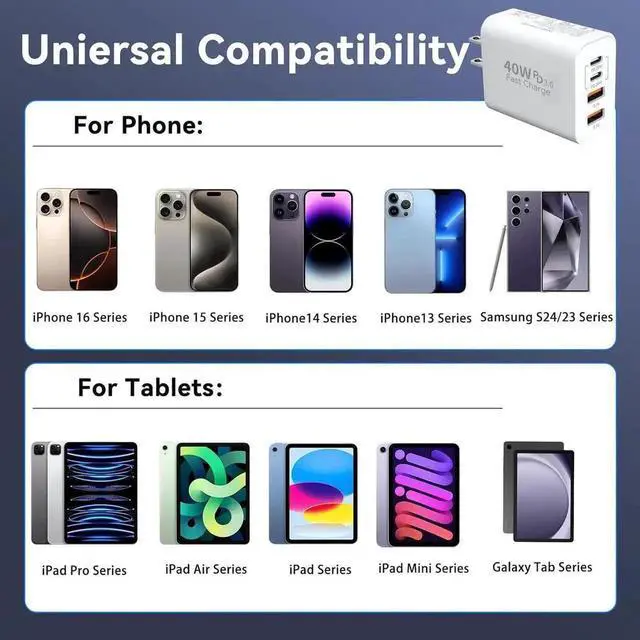 ![Alt view image 7 of 7 - JAENFONG [2 PACK] USB C Wall Fast Charger Block, 40W 4-Port Type C Charger Fast Charging Blocks PD Power Charger Adapter + QC 3.0 USB Multiport Charger Brick for i-Phone, i-Pad, Android Smartphones](https://c1.neweggimages.com/productimage/nb640/C1E6S25101202KR9174.jpg)