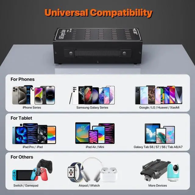 [Compatible with 99% of Smart Devices]The 30-Port Charging Station Compatible with iPhone 15/14/13/12/11/Pro/Pro Max/Xs/XS Max/XR/X/8/7, iPad Pro/Air 2/Mini, Galaxy S9/S8/S7/Edge/Plus, Note 8/7, LG Nexus, HTC and Motorola and other electronics. The 30-in-1 charging station has a carrying strap on the side for easy transportation. Also suitable for all kinds of occasions, such as industrial tests, offices, schools, shopping malls, cafes, restaurants and hotels, etc.