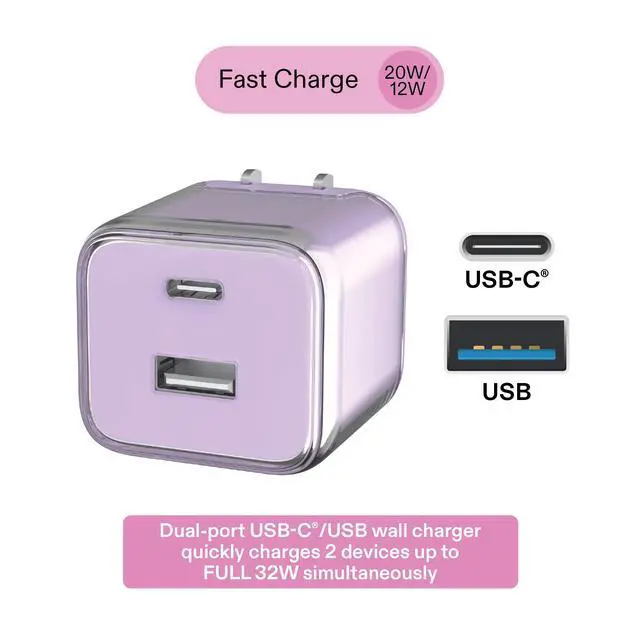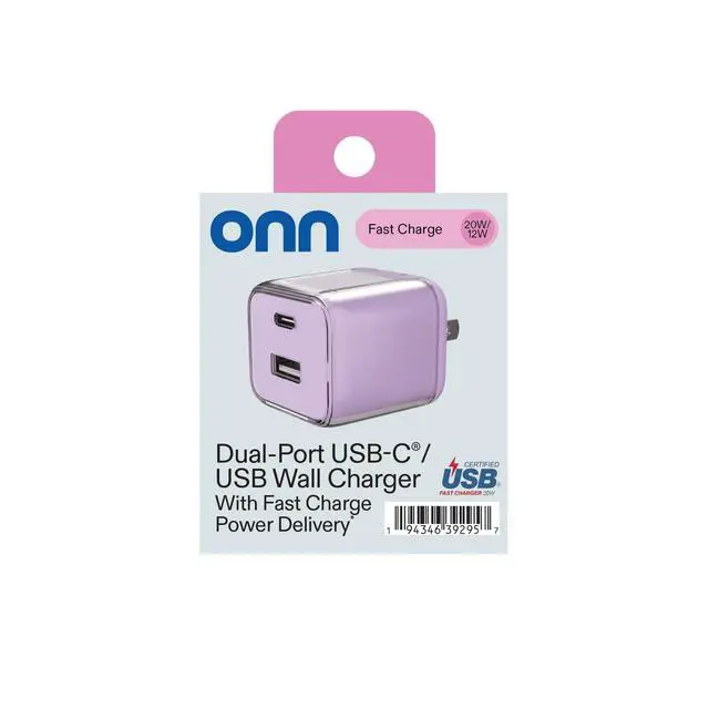 The onn Dual-Port USB-C/USB Wall Charger is a convenient and efficient charging solution for multiple devices. With its dual-port design, it can quickly charge two devices up to a total of 32W simultaneously, making it perfect for charging your phone, tablet, and other devices at the same time. The charger also features Fast Charge technology, which can deliver up to 20W or 12W of power to each port, depending on the device's requirements. Additionally, the charger has a dual layer construction for added durability and a stylish clear shell casing that adds a touch of elegance to any room. The foldable travel-friendly AC plug and LED power indicator make it easy to use on-the-go, and it's available in multiple colors to match your personal style. Stay connected with the onn Dual-Port USB-C/USB Wall Charger.