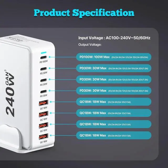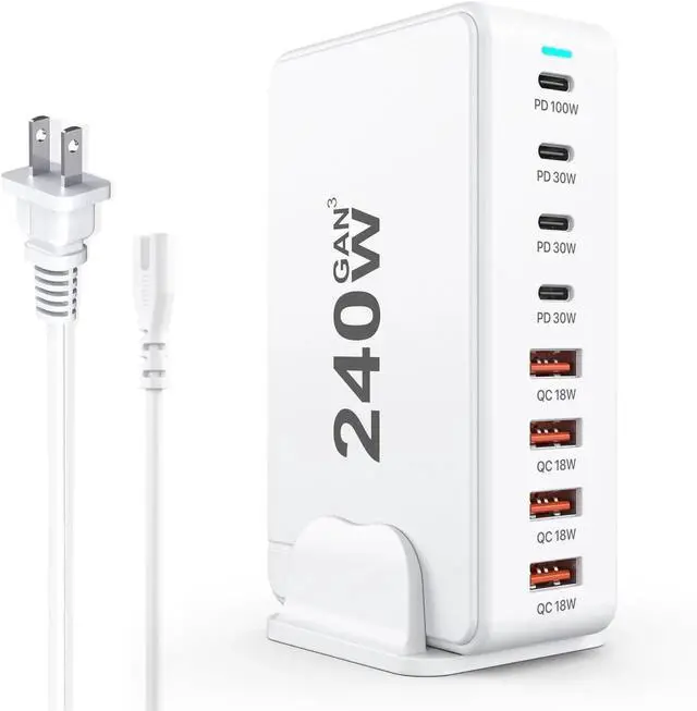8-port USB C fast charging station 4 USB-C ports (USB-C 1: 100 W, USB-C 2: 30 W, USB-C 3: 30 W, USB-C 4: 30 W) and 4 USB-A ports (QC18W), with a total power of up to 240W, compatible with almost any smartphone, laptop, tablet, smartwatch, earphone, power bank, fan, fast and safe charging. The lower support base of the charging station ensures that the charger remains stable when placed vertically.