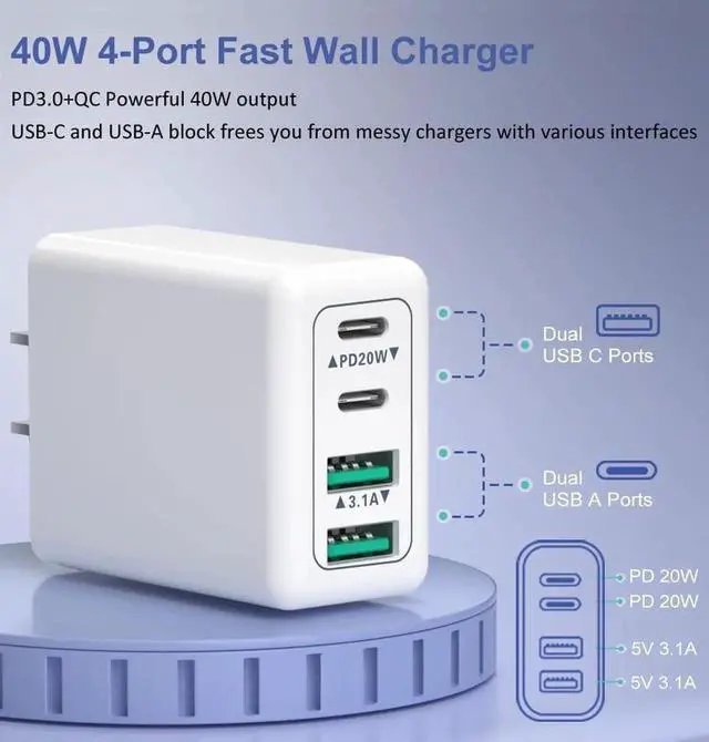 ![Main image of [3-Pack] USB C Wall Charger, 40W 4-Port USB C Charger Block, Fast Charging Block Dual Port PD + QC 3.0 Wall Plug Multiport Type C Compatible with i-Phone 14/13/12/11/Pro Max/XS, Android Phones,Tablet](https://c1.neweggimages.com/productimage/nb640/C601S2604150JKXGY88.jpg)