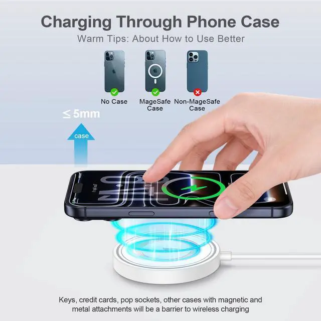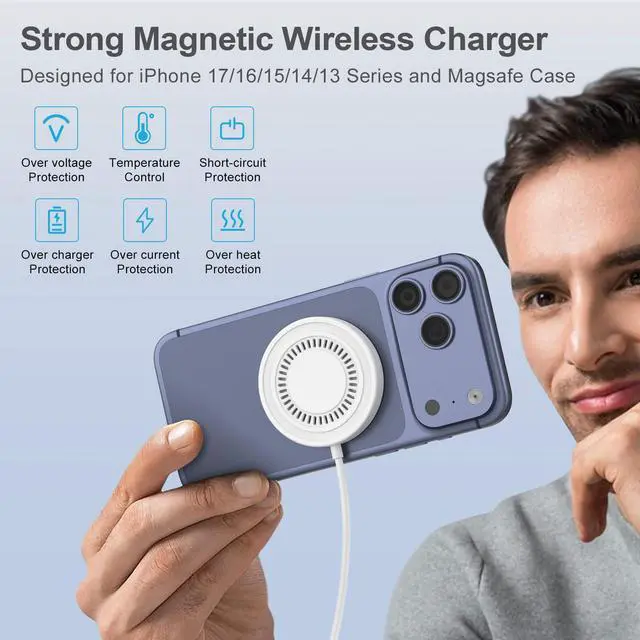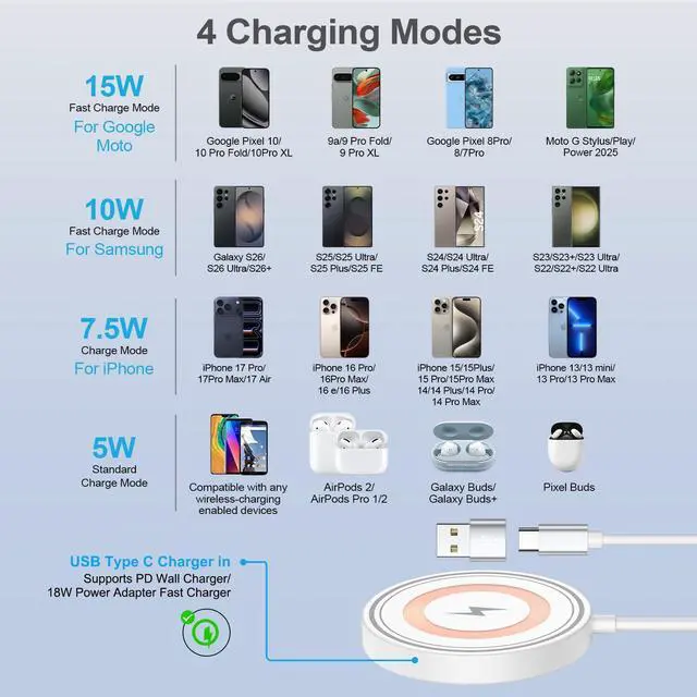 7.5W fast wireless charger mode for iPhone 17/17 air/17 pro/17p pro max/16/16 pro/16 plus/16 pro max, and 5W wireless charger mode for phones which support wireless charging function.