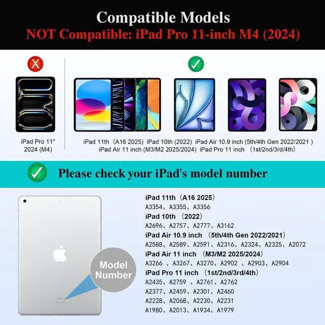 | Compatible Devices | iPad Air 11" (M3 2025/M2 2024), iPad 11"(A16)/10th Gen (10.9"), Air 5th/4th Gen 10.9", Pro 11"4th/3rd/2nd/1st Generation |