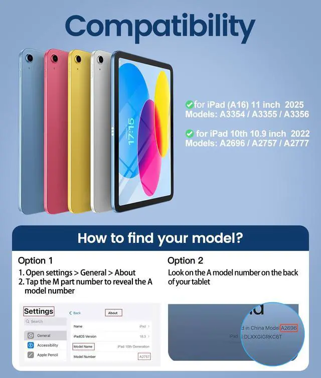 | Compatible Devices | For iPad (A16) 11th generation 11-inch 2025 (Model: A3354/A3355/A3356), For iPad 10th generation 10.9-inch 2022 (Model: A2696/A2757/A2777) |