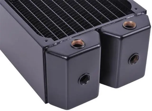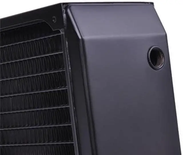 Fin spacing is always an important factor in radiator design. The new series from Alphacool has a fin design which allows it to perform extremely well even with slow-spinning and medium-speed fans. This is not only pleasant thanks to the fact that it avoids unnecessary noise; it also means that the choice of fans that can be used with these radiators is not restricted. Even mounting and installation of fans and radiator grills is easy and versatile with these radiators. Even the dreaded insertion of a screw too far into the radiator does not result in expensive damage. Unlike other radiators, the NexXxos series is equipped with an internal protective ledge which stops the screw before it damages the fins.