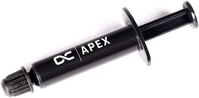 Only liquid metal thermal pastes offer better thermal conductivity. The Apex Thermal Grease is delivered in a 1g applicator with screw cap. The amount of thermal paste is sufficient for several applications and can be stored in the applicator protected from drying out. In addition, Apex Thermal Grease is non-conductive and non-caustic. If a small amount of paste is spilled during application, damage to the hardware is highly unlikely. Technical DataThermal Conductivity17 W/mkVolatilization Rate (24H@200°C)%Less than 0.5D ensity (g/cc) 3.2 (Test method ASTM D792) Viscosity (mPa. s)150~200*10³ (Test method ASTM D2196) Operating Temperature (°C)-40°C to 120°CBreakdown Voltage (V/mil)250 (Test Method ASTM D149) Thermal Impedance (°C in 2/W) 0.10 +/- 0.1 (Test method ASTM D5470) Max.
