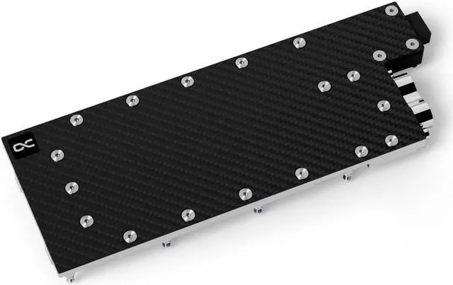 The Alphacool ES Copper/Carbon water cooler with backplate was specially developed for the Alphacool Enterprise Series. The positioning of the connections significantly simplifies the tubing of the cooler in the server rack. The cooler top is made of carbon and makes the water cooler lighter compared to Alphacool's ice blocks with acetal or acrylic tops. Thanks to the compact design, the cooler only needs 1 slot in the server rack instead of the previous 1.5 slots, which offers additional space savings and makes the use of the ES Copper/Carbon GPU water cooler even more attractive.