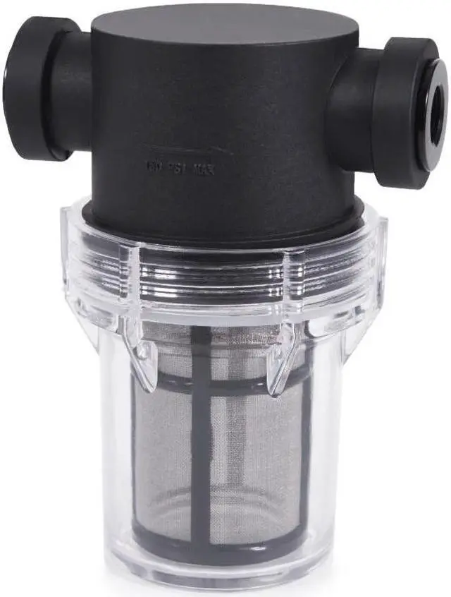 MaintenanceThe particle filter has a crystal-clear acrylic cylinder, which is used to collect suspended matter and provides a visual check on the state of contamination. The large volume of the cylinder and the resulting absorption capacity of dirt particles considerably extends the maintenance intervals. When installing the ES Inline particle filter, a ball valve can be placed in front of the IN connection and behind the OUT connection. This makes it much easier to remove the particle filter for maintenance (cleaning). Technical dataL x W x H95 x 69 x 122 mmMaterialSynthetic material, acrylicWeight201 gColorBlack/ClearConnection thread2x G1/2" (with enclosed adapters to 2x G1/4")Max.