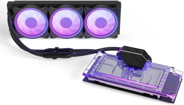 The Alphacool Eiswolf 2 is the first full cover GPU AIO waterblock from Alphacool. It is based on the Alphacool GPX Eisblock Aurora GPX water block, a pump unit and a 360mm NexXxoS ST30 full copper radiator. The latter is equipped with the Alphacool Aurora Rise Digital RGB fans. Fullcover WaterblockThe Eiswolf 2 graphics card AIO water block not only cools the GPU with liquid but also all relevant components that require active cooling. This includes the graphics memory, the VRM and, if necessary, other components that require direct cooling. By using the Eisblock GPX Aurora water cooler, the cooling capacity is identical to that of a DIY graphics card water cooler.