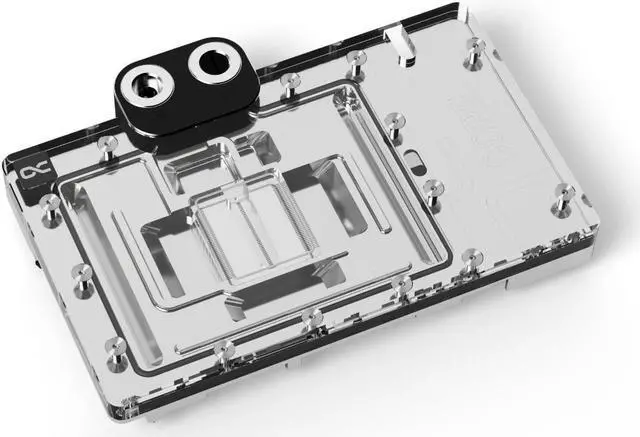 Additionally, chrome plating looks much more homogeneous and provides a shine that cannot be achieved by nickel plating. Chrome-plated coolers have previously only been used in the industrial sector in areas where extreme influences act on the coolers. DesignThe Aurora design of the Geforce RTX 40XX Eisblock generation is visually calmer and simpler. Only one O-ring runs around the entire cooler. The design around the cooling fins and jetplate makes for a cleaner look. The illumination of the digitally addressable RGB LEDs is even better distributed throughout the cooler as a result of the chrome plating.
