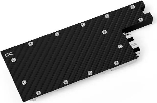 The Alphacool ES Copper/Carbon water cooler with backplate was specially developed for the Alphacool Enterprise Series. The positioning of the connections significantly simplifies the tubing of the cooler in the server rack. The cooler top is made of carbon and makes the water cooler lighter compared to Alphacool's ice blocks with acetal or acrylic tops. Thanks to the compact design, the cooler only needs 1 slot in the server rack instead of the previous 1.5 slots, which offers additional space savings and makes the use of the ES Copper/Carbon GPU water cooler even more attractive.