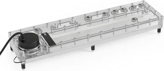 The Alphacool Core Distro Plate with integrated pump is an absolute must-have for all custom water cooling systems! With its core design, it is not only an absolute eye-catcher, but also a functional masterpiece that simplifies the construction and planning of complex water loops and offers uncomplicated installation. The Distro Plate is made of high-quality acrylic and fitted with chrome-plated G1/4’ brass connections. These have been recessed and deliberately not screwed in to minimize the risk of cracks and leaks while increasing stability. The connections are made of two parts, have an O-ring and counter each other when mounted in the acrylic.