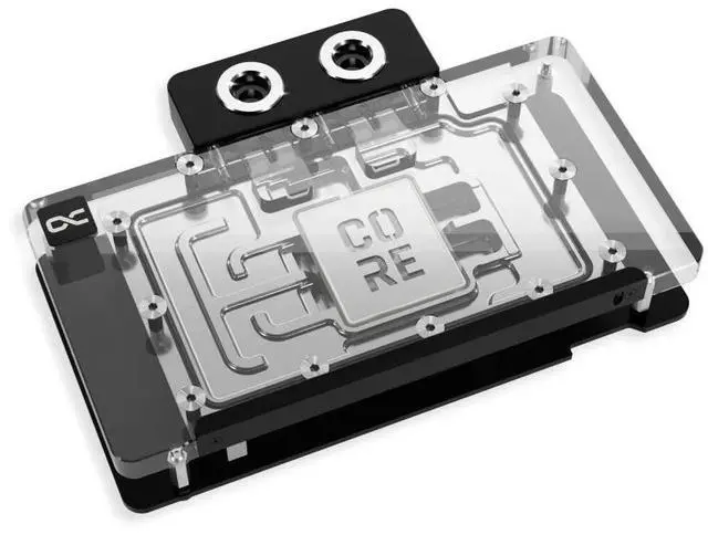 A special highlight is the newly added Core emblem above the jet plate, which underlines the affiliation with the Core series and visually enhances the design. The series continues to rely on high-quality brass connectors that guarantee optimal quality and safety. The specially adapted aluminum backplate covers the entire back of the copper cooler and ensures a clear and uniform appearance. The acrylic, combined with the aRGB lighting, enables uniform and impressive illumination of the entire cooler. Technically, the GPU water cooler has been completely redesigned. To optimize cooling performance, the gaps between the cooler and the PCB components were redefined and tested.
