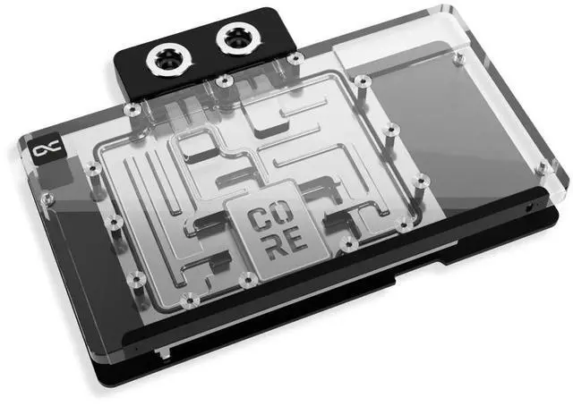 At the center of the cooler is the copper cooler milled from a single piece, complemented by a precisely machined brass connection terminal with a nylon cover. Chrome plating makes the copper cooler more durable and ensures a smoother and brighter surface than conventional nickel plating. The visual design of the GPU water cooler has been only slightly changed. A special highlight is the newly added Core emblem above the jet plate, which underlines the affiliation with the Core series and visually enhances the design. The series continues to rely on high-quality brass connectors, guaranteeing optimal quality and safety.