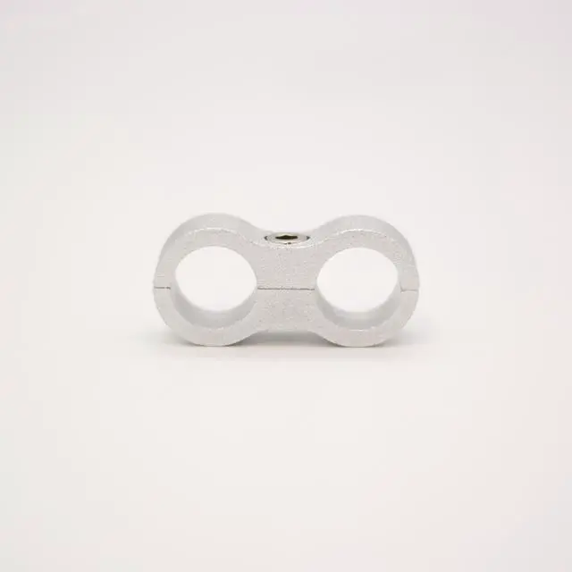 To install, simply remove the central set screw and separate the clamp into it's two halves. Place both halves around the 2 tubes to be managed, and secure the halves back together by replacing that set screw.