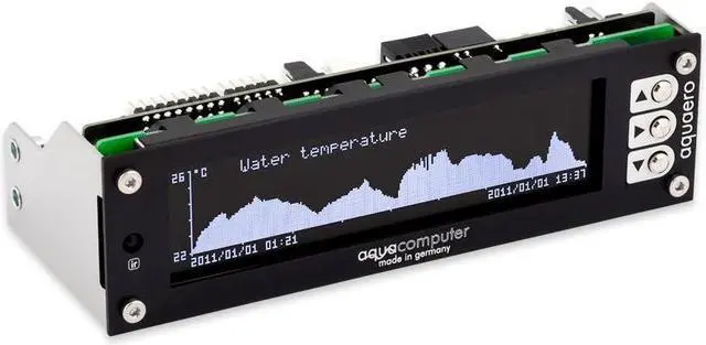 The aquaero is an absolutely autonomous working microprocessor-controlled device with USB 2.0 interface. All speed parameters and sensor values can be set and visualized in an user-friendly menu or through an even easier to use PC-software. Additionally, the graphic LC display can be used to display almost any information using the popular LCD software LCDHype. The key features of the aquaero 6 include Programmable four channel fan controller Graphic LC display with backlight (except LT version) USB 2.0 and aquabus interface Four fan outputs with up to 30 Watt of power per channel All fan outputs with 4-Pin plug, switchable between voltage and PWM control Versatile control options Eight temperature sensor inputs Flow sensor input Universal IR receiver (except LT version) Three LED outputs Potential-free switch Two additional power outputs Extensive alarm options Acoustical alarm Speed signal output for status evaluation Expandable to a maximum of 12 fan channels For a more thorough feature description, we recommend to download the manual: aquaero_5_6_en_2016_10_14.pdf Several aqua computer products can be used to expand the functionality of the aquaero 6 controller. These expansions are dynamically mapped into the menus and display pages of the aquaero, creating a consitent control system rather than individual devices. In maximum configuration, the following devices can be connected to an aquaero 6 simultaneously 2x aquastream XT/ULTIMATE pumps 8x poweradjust 2/3 1x aquaero 5/6 LT (in this case only 4x poweradjust 2/3) 4x mps based devices (flow sensor, pressure/fill level sensor and D5 pump with aquabus) 2x farbwerk controller 1x Real Time Clock expansion module Scope of delivery aquaero 6 PRO controller four temperature sensors, length approx. 70 cm one internal USB cable, length approx. 100 cm one connection cable for speed signal or aquabus manual mounting material for installation into a free extension bay Notes on the aquasuite software With this product you receive a license for the current and next year version of the software. Please note that an Internet connection is required for the installation and activation of the software. Further information about the licensing and activation of the aquasuite software can be found here.
