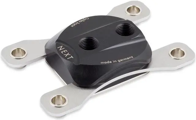 Models with VISION module are equipped with modern electronics: High resolution OLED display, integrated water temperature sensor and USB interface are just three of the features. Base part with micro structureThe base part of the cuplex kryos NEXT is equipped with an extremely fine micro structure, the structural width is lower than 200 µ m. The coolant is injected centrally through a slot-shaped nozzle and then runs to both sides of the structure. The base itself is manufactured from copper, nickel plated copper or. 925 sterling silver depending on model. Retention systemThe cuplex kryos NEXT retention system consists of 2.5 mm thick stainless steel plates equipped with nickel plated spring cups. Springs and knurled screws secure the water block on the motherboard, the retention system has a very clean look when installed. All retention system versions feature a mechanical stop for optimum clamping force and even force distribution. The knurled screws can be installed by hand, additionally a hexagon socket wrench can be used for easy installation. Water blocks for socket 115x or AM3 include a steel back plate with silicone insulation to stabilize the CPU region of the motherboard. Socket 2011, AM4 and TR4 motherboards already include a back plate as part of the CPU socket, therefore no additional back plate is required.