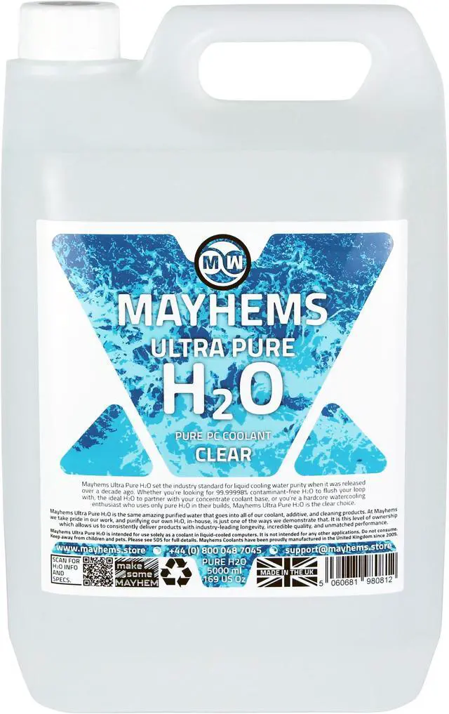 The product is also made using food safe bottles meaning there is much less leakage of the components from the plastic bottle leaching into the water. This all gives you the knowledge that everything in our power has been done to be able to deliver the perfect liquids for any water cooling loop. There is no other water on the market as pure as Mayhems Ultra Pure H2O. Features & Benefits- Ultra Pure water produced to the highest standards- Highest coolant thermal performance when used with the correct additives- Combines perfectly with Mayhems Coolant Concentrates- Average Electrical Conductivity of less than 2μ S or approximately 1 PPM.