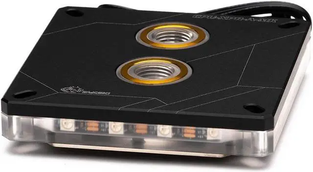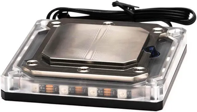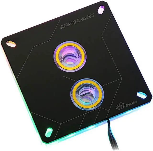 The Bykski CPU-XPR-A-MK CPU Water Cooling Block features an aluminum top plate that covers the precision machined PMMA top. The PMMA on the sides and around the ports allow the colors to flow through when the included RBW lights are engaged.