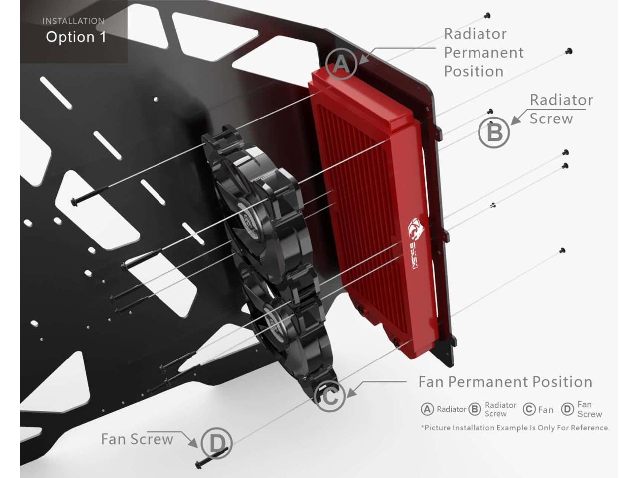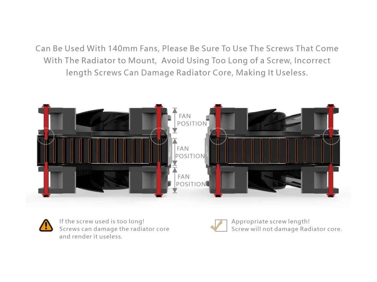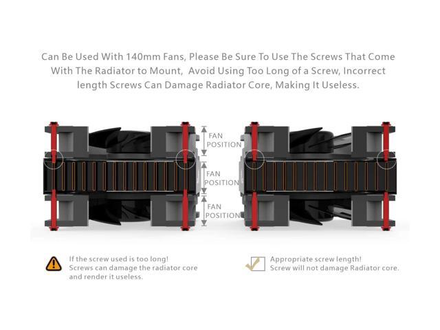 - Please pay attention to the length of the screw. If the screw is too long, it will break through the radiator and cause water leakage, voiding the warranty. Radiator comes with M3X30mm screws suitable for fans of 25mm thickness. If you want to install a thinner or thicker fan, please use the right length of the screw. (Fan thickness+5mm max)