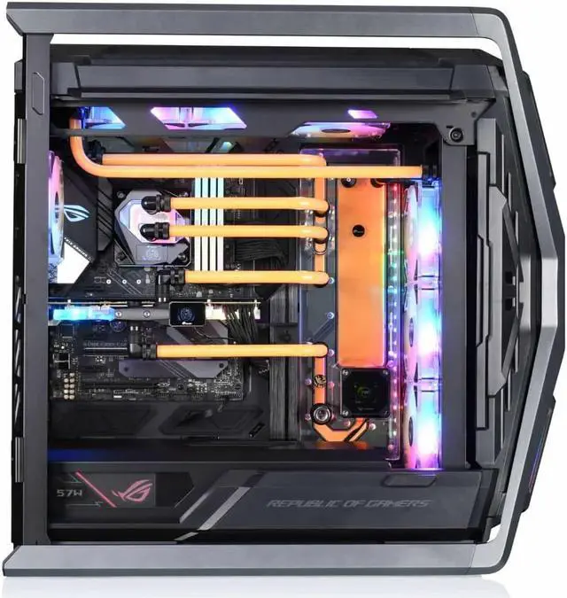 The Distro Plate is built using PMMA material, featuring G 1/4 threads, and is designed to be compatible with the ASUS ROG Hyperion GR701 case. It works well with Aluminum and Non-Aluminum loops and is engineered to support radiators up to 30mm thick or less.