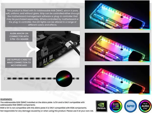In addition to the Distro Plate itself, the package includes mounting hardware, an A-RGB (RBW) LED strip, and the option of including a DDC pump with armor, a DDC pump with LCD, or no pump at all. Bykski Distro Plates are an excellent option for those looking for a clean, visually appealing water-cooling solution that provides high-quality performance.