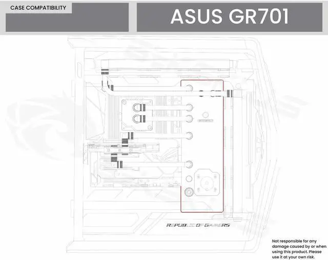 This distro is designed specifically for this case. Depending on the motherboard, blocks, fittings used, and layout, the connecting tubing may not appear as pictured (perfectly horizontal). Not responsible for any hardware damage. Use at your own risk.