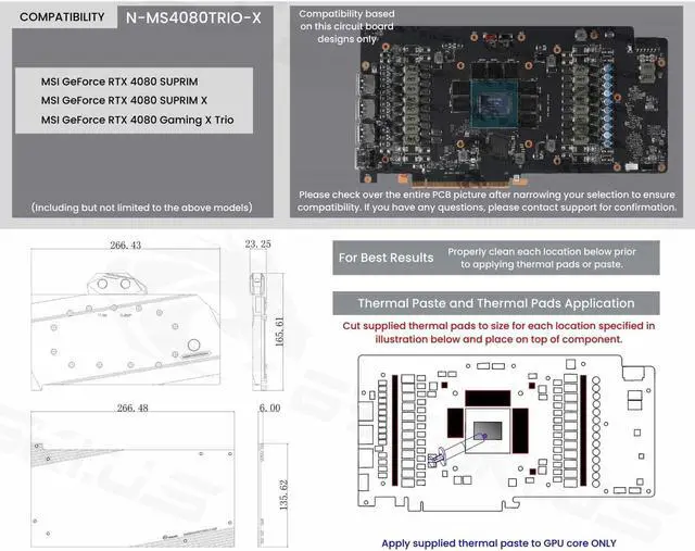 The manufacturer reserves the right to alter the block design to expand compatibility. The delivered item may not 100% match the pictured item. The product does NOT come with English instructions. Please see the product gallery images for the install guide if available. Generally, thermal pads should be installed on the card where the block has corresponding raised contact points, except the GPU core, which uses thermal paste. Installing pads on other components can lead to improper contact and poor performance.