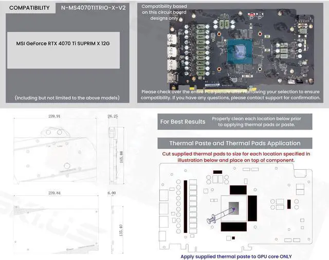The manufacturer reserves the right to alter the block design to expand compatibility. The delivered item may not 100% match the pictured item. The product does NOT come with English instructions. Please see the product gallery images for the install guide if available. Generally, thermal pads should be installed on the card where the block has corresponding raised contact points, except the GPU core, which uses thermal paste. Installing pads on other components can lead to improper contact and poor performance.