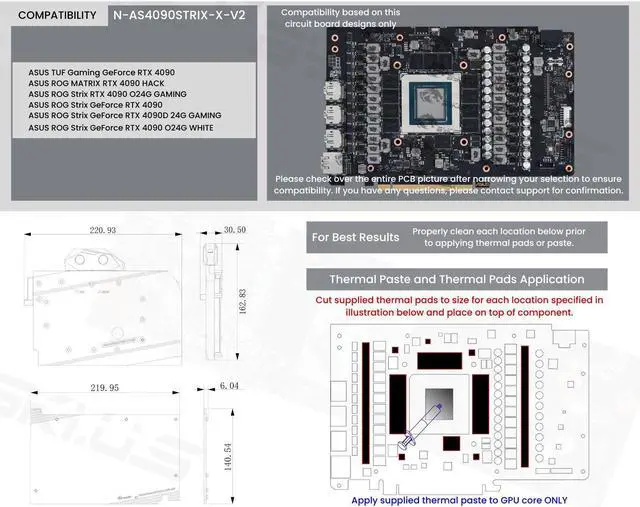 The manufacturer reserves the right to alter the block design to expand compatibility. The delivered item may not 100% match the pictured item. The product does NOT come with English instructions. Please see the product gallery images for the install guide if available. Generally, thermal pads should be installed on the card where the block has corresponding raised contact points, except the GPU core, which uses thermal paste. Installing pads on other components can lead to improper contact and poor performance.
