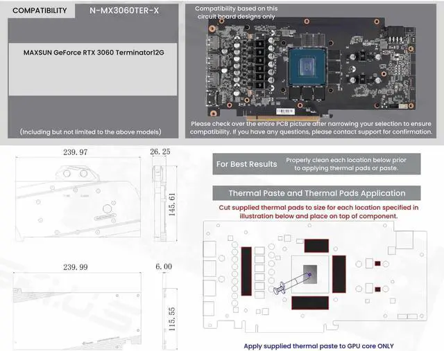 The manufacturer reserves the right to alter the block design to expand compatibility. The delivered item may not 100% match the pictured item. The product does NOT come with English instructions. Please see the product gallery images for the install guide if available. Generally, thermal pads should be installed on the card where the block has corresponding raised contact points, except the GPU core, which uses thermal paste. Installing pads on other components can lead to improper contact and poor performance.