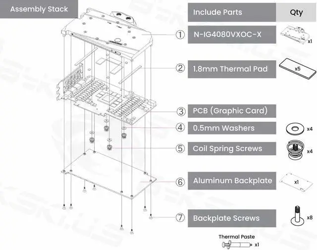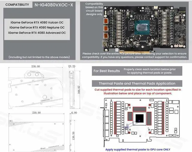 The manufacturer reserves the right to alter the block design to expand compatibility. The delivered item may not 100% match the pictured item. The product does NOT come with English instructions. Please see the product gallery images for the install guide if available. Generally, thermal pads should be installed on the card where the block has corresponding raised contact points, except the GPU core, which uses thermal paste. Installing pads on other components can lead to improper contact and poor performance.