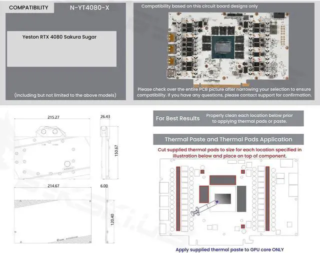 The manufacturer reserves the right to alter the block design to expand compatibility. The delivered item may not 100% match the pictured item. The product does NOT come with English instructions. Please see the product gallery images for the install guide if available. Generally, thermal pads should be installed on the card where the block has corresponding raised contact points, except the GPU core, which uses thermal paste. Installing pads on other components can lead to improper contact and poor performance.