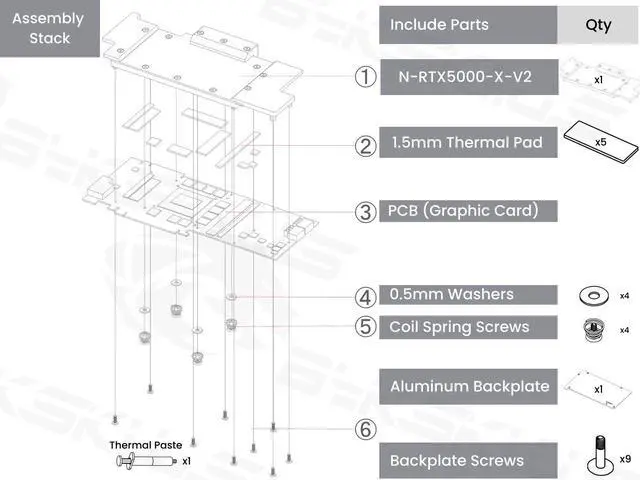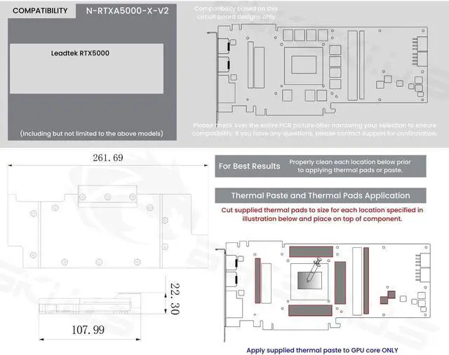 The manufacturer reserves the right to alter the block design to expand compatibility. The delivered item may not 100% match the pictured item. The product does NOT come with English instructions. Please see the product gallery images for the install guide if available. Generally, thermal pads should be installed on the card where the block has corresponding raised contact points, except the GPU core, which uses thermal paste. Installing pads on other components can lead to improper contact and poor performance.