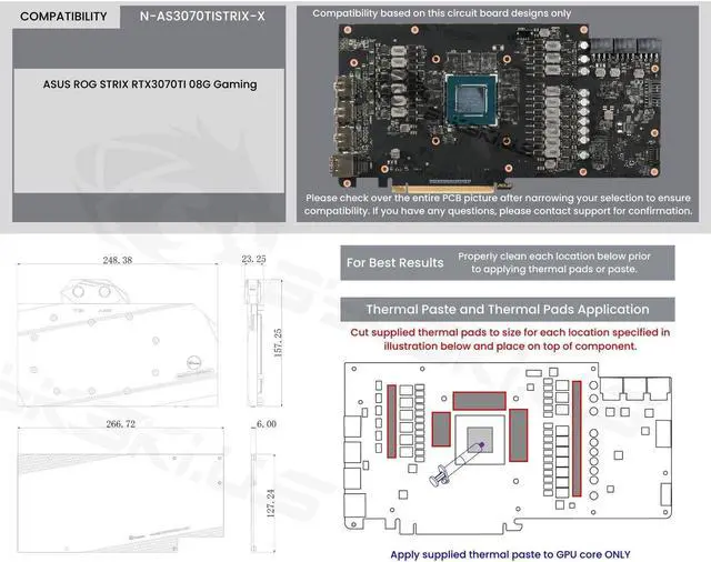 The manufacturer reserves the right to alter the block design to expand compatibility. The delivered item may not 100% match the pictured item. The product does NOT come with English instructions. Please see the product gallery images for the install guide if available. Generally, thermal pads should be installed on the card where the block has corresponding raised contact points, except the GPU core, which uses thermal paste. Installing pads on other components can lead to improper contact and poor performance.