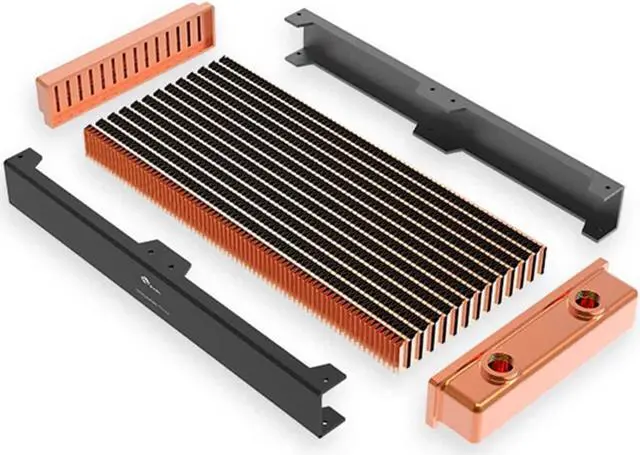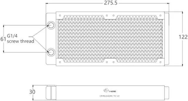 Bykski CR-RD240RC-TN-V2 radiator is designed as a single row of copper channels. The thickness of the radiator is 30mm which allows this radiator to be mounted in smaller profile locations. The water channels and wave fins are made of red copper with a thermal conductivity up to 401 w/(M.K.). There are 14 water channels aligned in a single row.