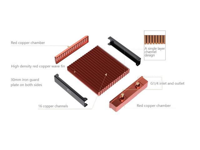 - Designed as a single row of copper channels. The thickness of the radiator is 30mm which allows this radiator to be mounted in smaller profile locations. The water channels and wave fins are made of red copper with a thermal conductivity of up to 401 w/(M.K.). There are 16 water channels aligned in a single row. 16 Channel Design. Industry Standard G1/4 Thread. High-Quality Copper Design. Material: Red Copper / Iron side plates (not in contact with coolant. Compatible with three 140mm fans.